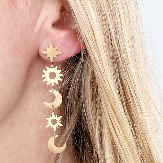 Pendientes Largos Luna Sol Estrella Destello con Baño de Oro
