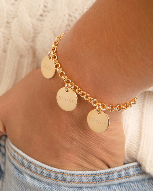 Pulsera Personalizada con Cadena Rolo con Baño de oro y tres medallas
