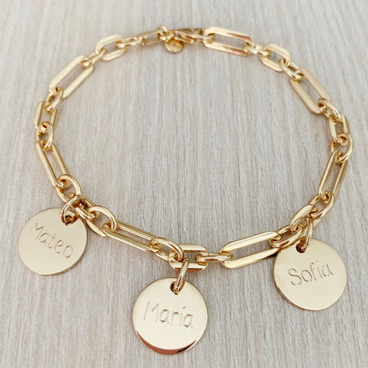Pulsera Personalizada con Cadena de Eslabón Combinado con Baño de oro y tres medallas