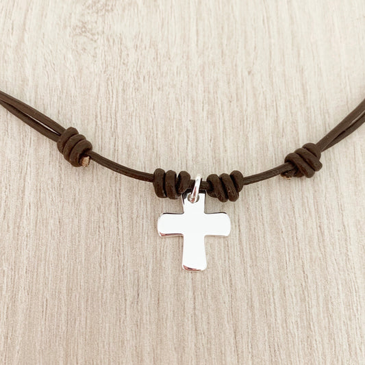 Collar de Cuero con Cruz de Plata para Niña o Niño personalizable