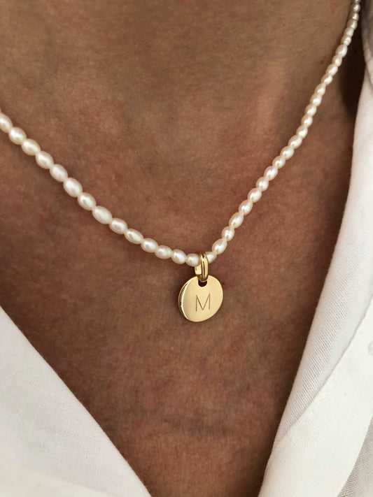 Collar Personalizado con Medalla grande con baño de Oro grabada y Perla