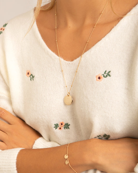 Collar Personalizado con Medalla grande grabada y Cadena de Bolitas con baño de Oro