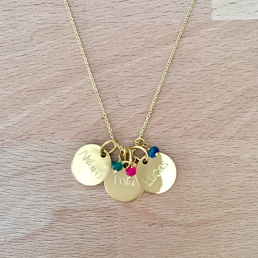 Collar Personalizado con tres Medallas Medianas con baño de Oro grabadas y Piedras