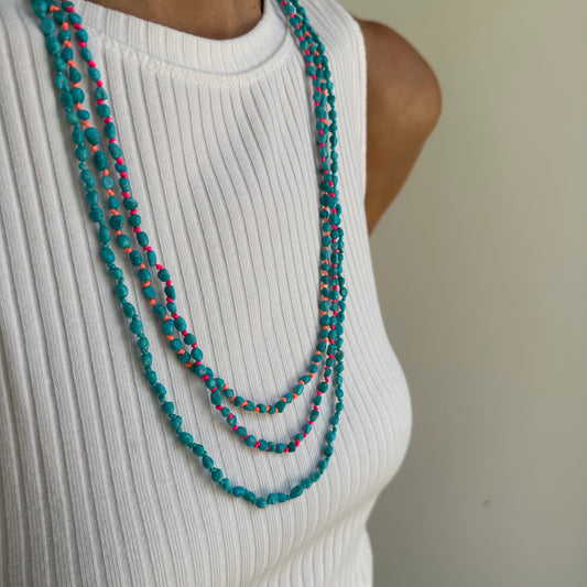 Collar Largo Turquesas Naturales y Cordón Naranja Fosforito