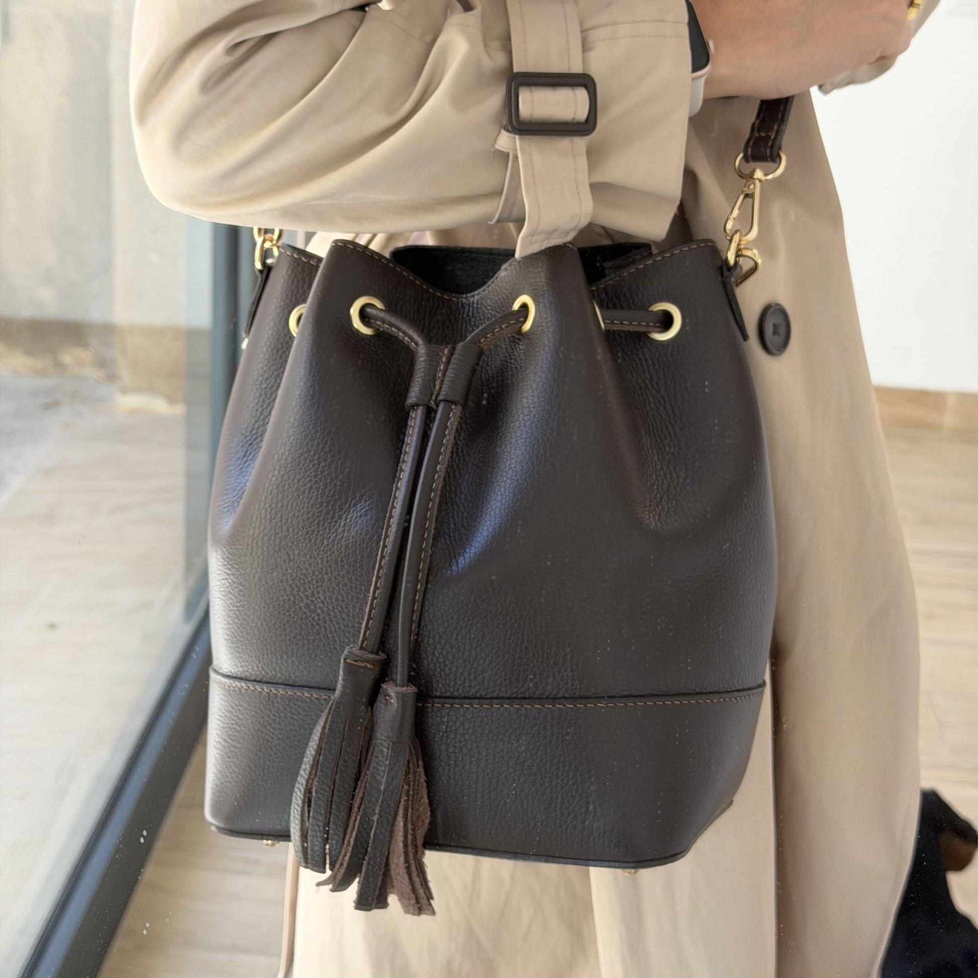 Bolso de piel de color marrón chocolate con forma de bombonera pequeña con asa corta y asa bandolera extraíbles. Abertura ajustable por cordón de piel del que cuelgan dos borlas con flecos de piel.