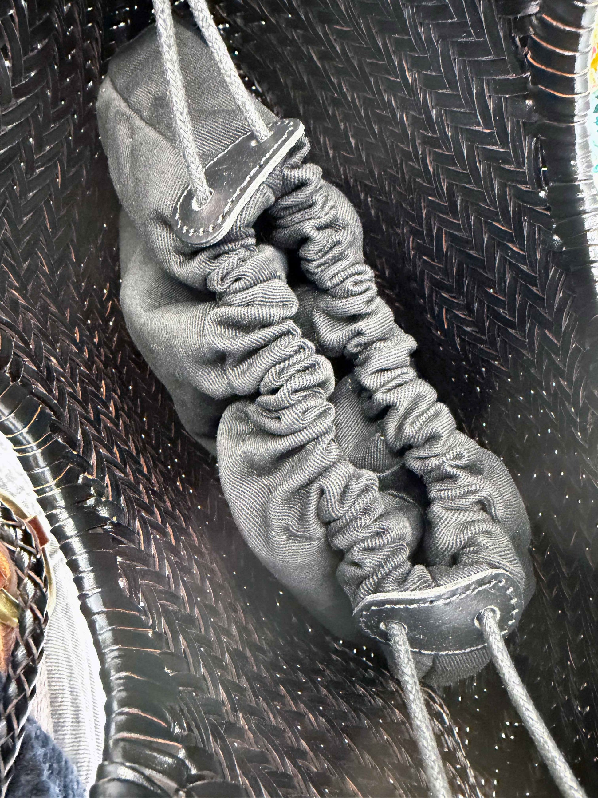Bolso tipo capazo de piel trenzada de color marrón chocolate. Incluye una bolsa de tela para guardar las pertenencias que se puede cerrar.
