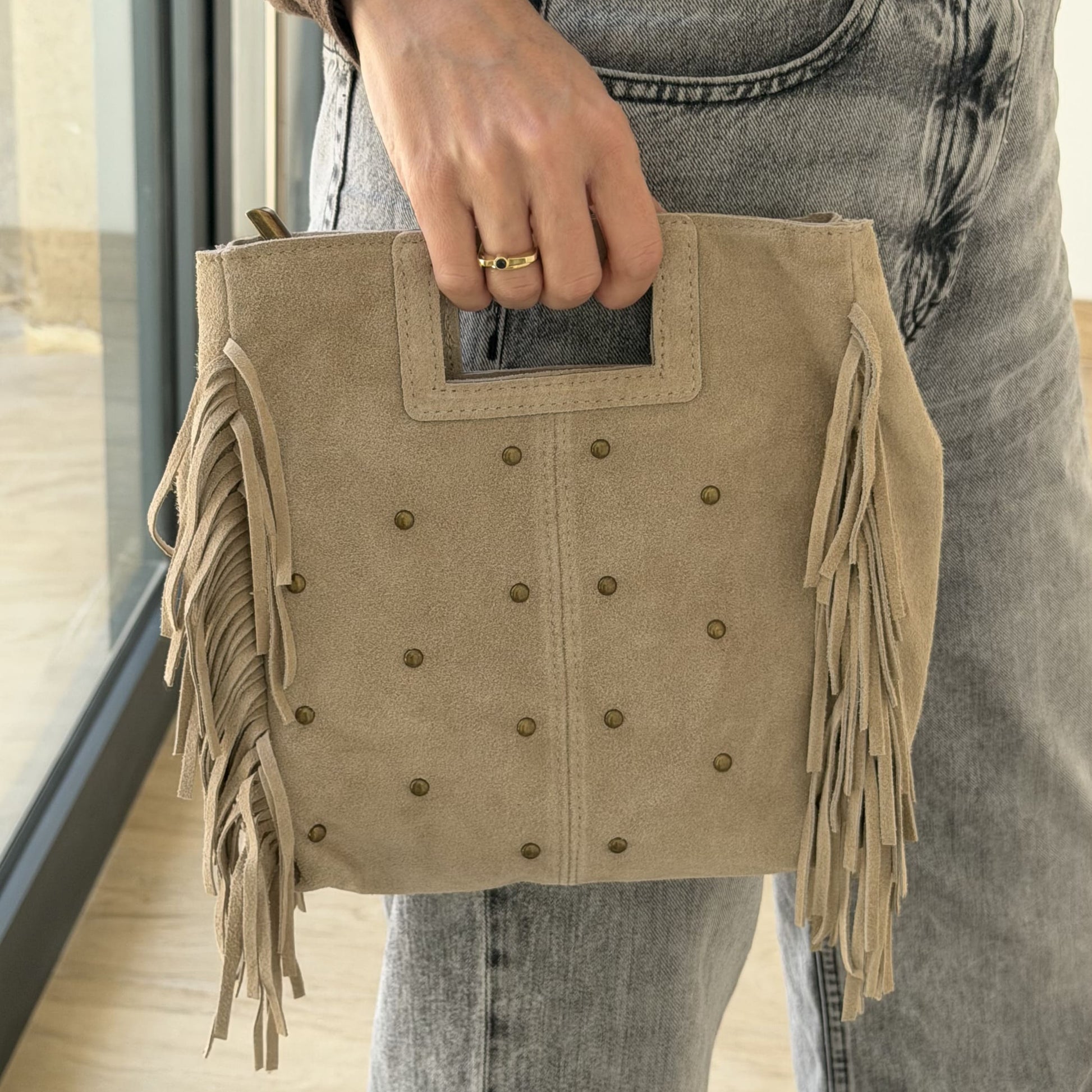 Bolso de serraje de forma cuadrada en color beige con tachuelas, asa incorporada y asa bandolera extraíble. De los laterales del bolso cuelgan unos flecos.