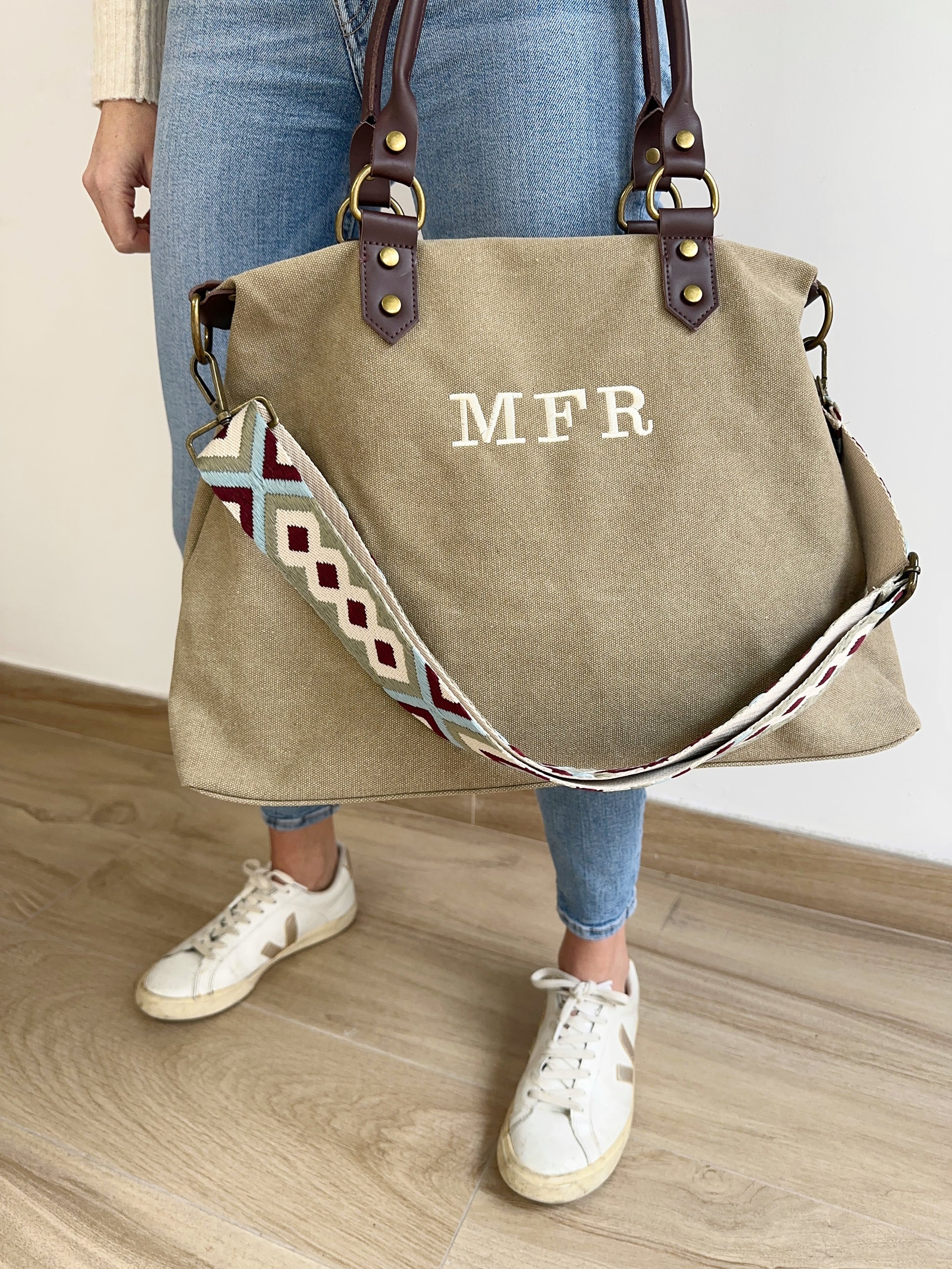 Bolso de lona y piel en color topo personalizado con iniciales bordadas.